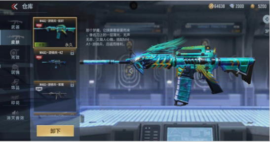 M4A1游骑兵航轩,孔雀蓝是孔雀身披的美丽华裳,蓝中带绿,明艳动人,它接近湖蓝色,但纯度不高,却仍保留着蓝色的特有气质,高贵而典雅,还传递出孔雀舞般的神秘意境。孔雀蓝的枪身为M4A1添了几分典雅之气!枪管部分飘散着孔雀蓝的枪樱增加了些许飘逸感!并伴随着金属黄互为补色,撞色效果十分惊艳,一冷一暖的调性协调。