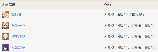 旅行者(雷)、荒泷一斗、神里绫华、九条裟罗