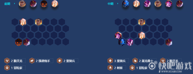 前期有黯灵龙的弈子直接留,可以赛娜+厄斐琉斯组成两炮手作为后排,芮尔+瑟庄妮组成两重骑兵作为前排,过渡的原则就是有后排有输出,两个格斗家、两个重骑兵、两个护卫都可以作为前排,两射手、两炮手、两神龙尊者,三法师都可以作为我们的后排。