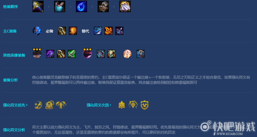 新装备圣盾使的誓约在棋子生命值降低到50%时会给周围三格内的友军提供护盾,利用黯灵龙的机制,我们献祭圣盾使的誓约,这样几乎人手一件圣盾使的誓约,可以抗住版本热门阵容四龙的伤害,加上雷恩加尔技能会去优先攻击护甲最低的敌人的机制,能很好的克制四龙