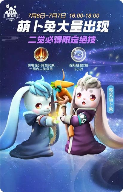 除此之外,御灵师在一周内将萌卜兔二觉,必得限定绝技。在拒宅日每日两小时活动时间内,御灵师捉妖更可获得双倍经验。