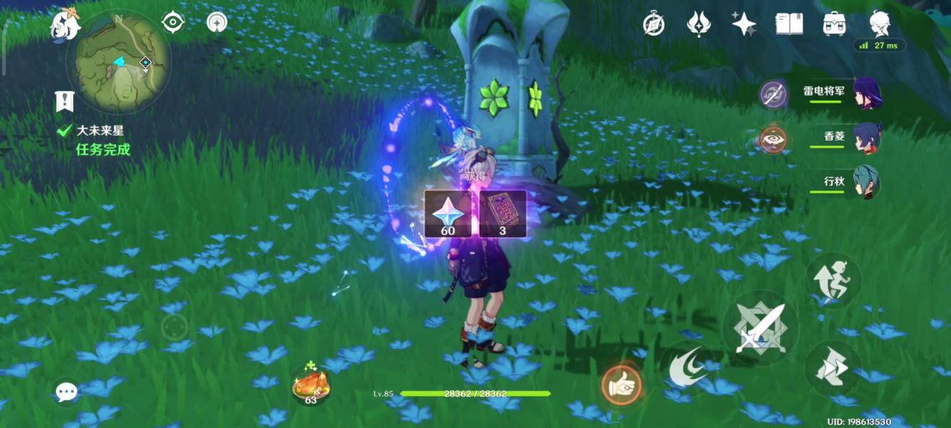 完成任务后获得60原石+3W摩拉+3本大经验书+6个精锻用磨矿。