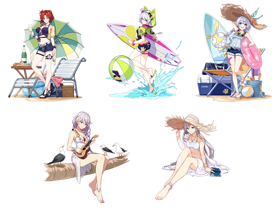 夏日沙滩套装圣痕包含:初始3★圣痕「琪亚娜·沙滩(上)」、「德丽莎·沙滩(中)」、「姬子·沙滩(下)」。