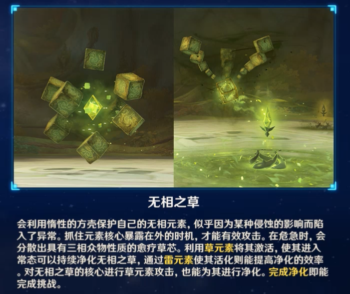 ●无相之草濒死时会释放三个愈疗草芯,草元素可将其激活,雷元素可将其活化加快效率。击败无相之草需要将愈疗草芯激活来净化或者草原是直接攻击其核心,所以草元素角色是必须的。