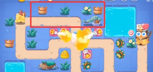 1.开局将原有的喷火器升级到满级,下图位置放置一个喷获取,锁定左边的灯笼,等到最后的怪走到,锁定下方的木桩子;