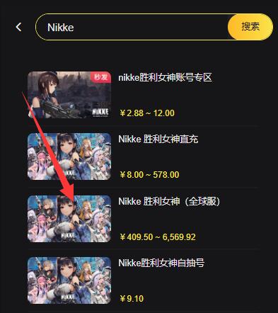 第三步:在搜索栏中输入【NIKKE胜利女神】点击搜索,再下方选择Nikke胜利女神充值,点击进入。