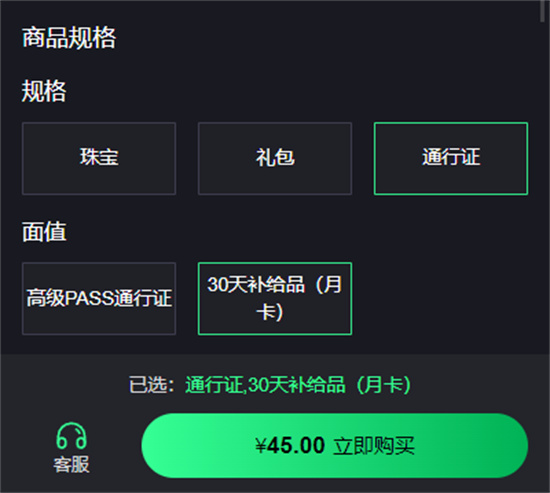 2、根据上一步的链接,即可进入胜利女神购买专题页,“规格”选择“通行证”就能看到“月卡”的购买选项了。
