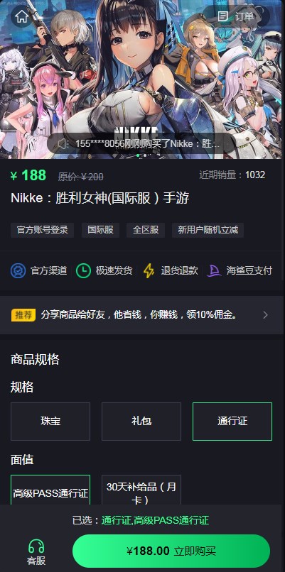 时间:2022-11-11 |nikke胜利女神国际服怎么充值月卡?国际服的月卡在国内无法直接买,需要找代充才能买到,因为国内对于海外游戏氪金是需要用海外银行卡的,因此代充是最方便最简单的充值方式,月卡购买的详情小编接下来就来给大家分享。