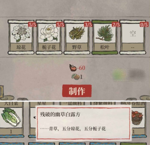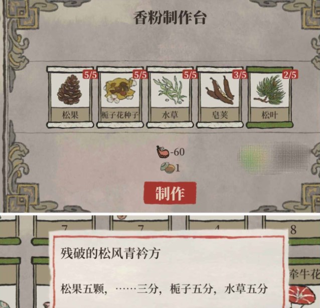 5、以上就是万花会四种香粉配方,注意:即使配方正确,香粉在制作过程中仍有概率失败,加入「松叶」×2可提高成功率。