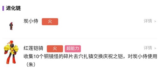 进化方法:收集10个铜镜怪碎片之后,前往穴扎镇,交换庆祝之铠,炭小侍使用之后变成红莲铠骑。