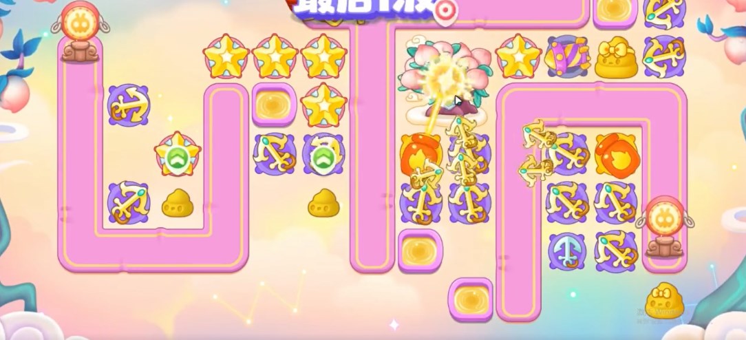 2、在靠近萝卜的地方建星星塔,继续清障,打香炉、桃子、大钟,有钱再建船锚打钱袋。