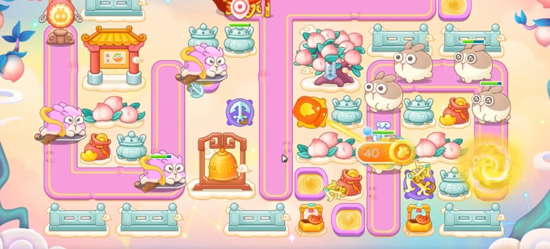 3、继续建炮塔,在兔子没有威胁到萝卜的时候,可以适当锁一锁桃树打桃子。
