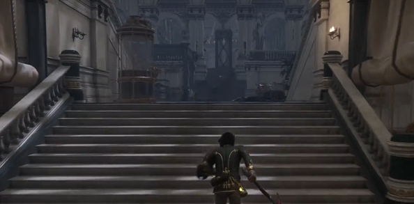1、首先来到博览会展厅如图所示的地方,一直往前走,在最上面的台子上的宝箱里可以拿到目标物品。