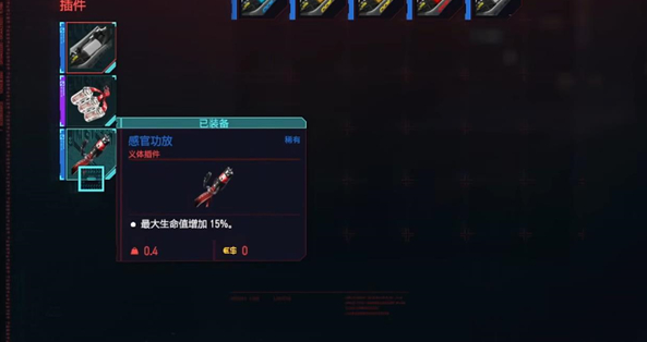 4、并且一些相关的义体插件也可以增加最大生命值,像是感官功放这件稀有插件就能增加15%的最大生命。