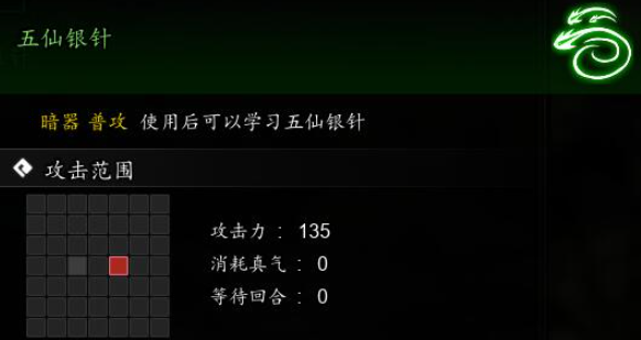 五仙教基础的暗器手法,对自身远距离1格范围造成伤害,使用不消耗真气