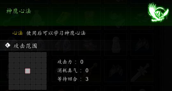 使用后自身真气+15%,闪避+10%,闪避强化效果持续3回合,使用不消耗真气。