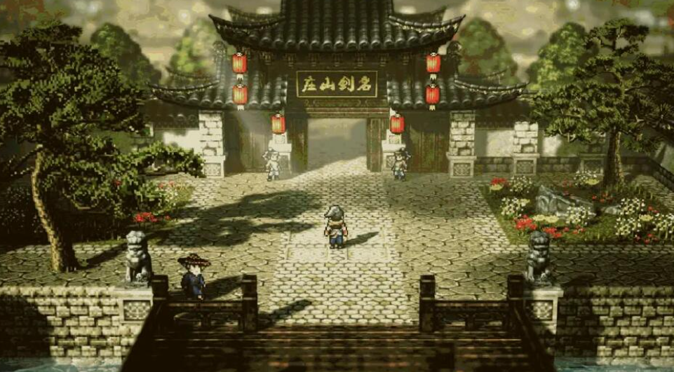 2、进庄门便能看见那气势非凡的洗剑池与其后“洗心问剑”四个大字,名剑山庄正是以传奇的铸剑技术和同样无与伦比的剑法而闻名。