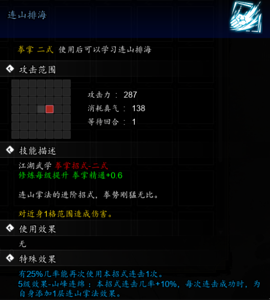 5级效果-山峰连绵:连击几率+10%,只要每次连击都成功就可以为自身添加1层连山掌法效果。