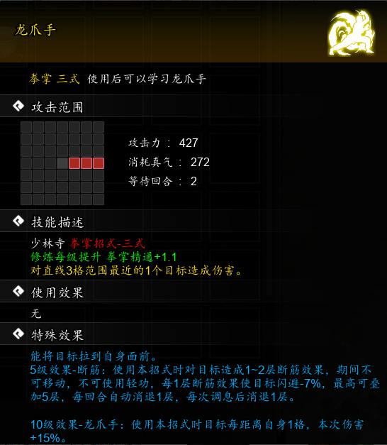 10级效果-龙爪手:使用本招式时目标每距离自身1格,本次伤害+15%。