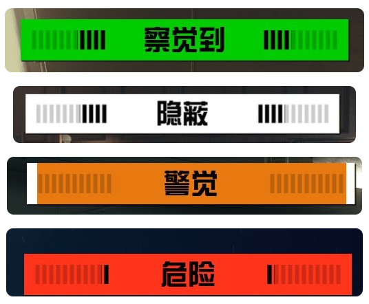 首先玩家在点了潜行技能之后,头上就会出现潜行状态条,共有4种状态,察觉到,隐蔽,警觉,危险。
