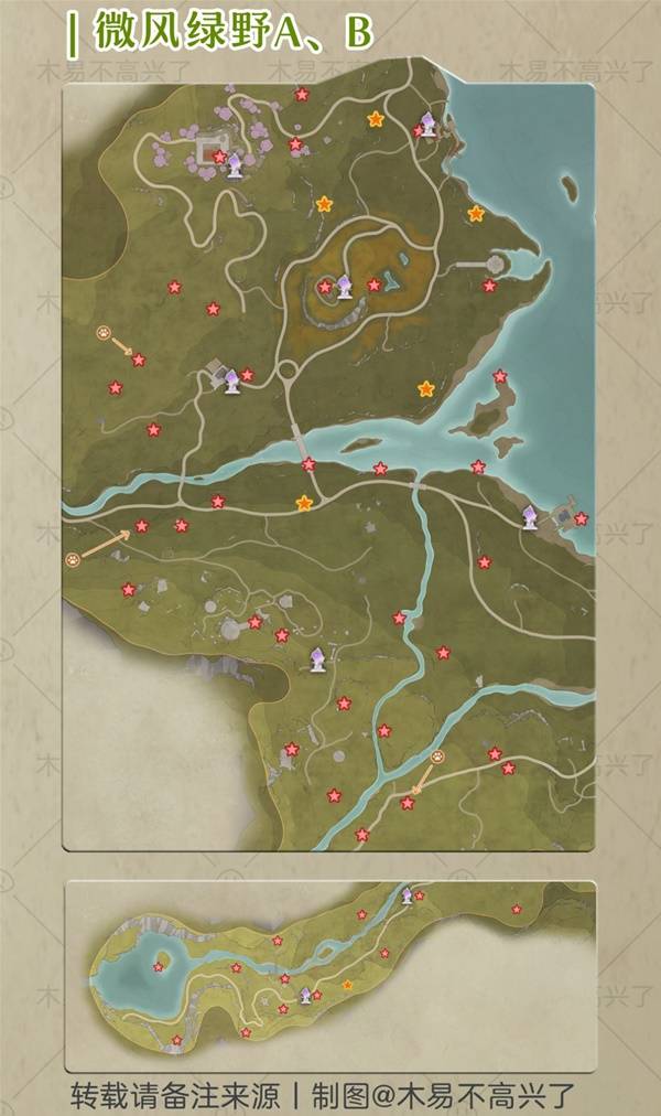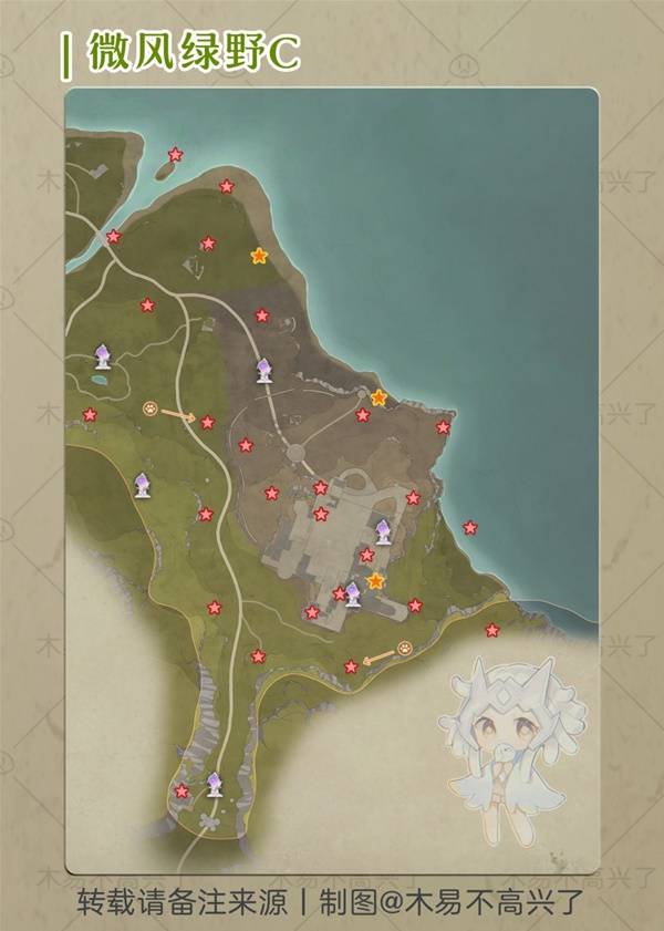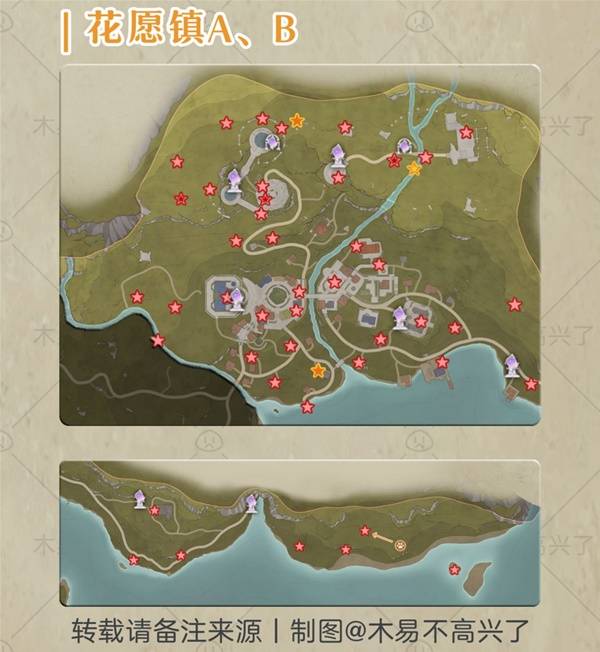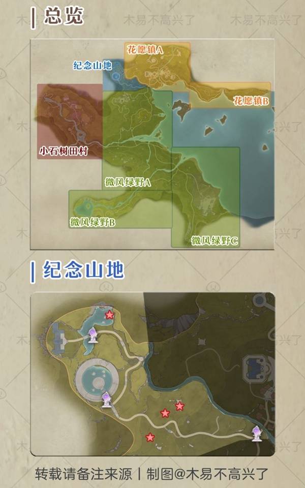 含纪念山地·花愿镇·微风绿野·小石树田,奇想星是核心收集元素,看见大喵的提示最好就去收哦。