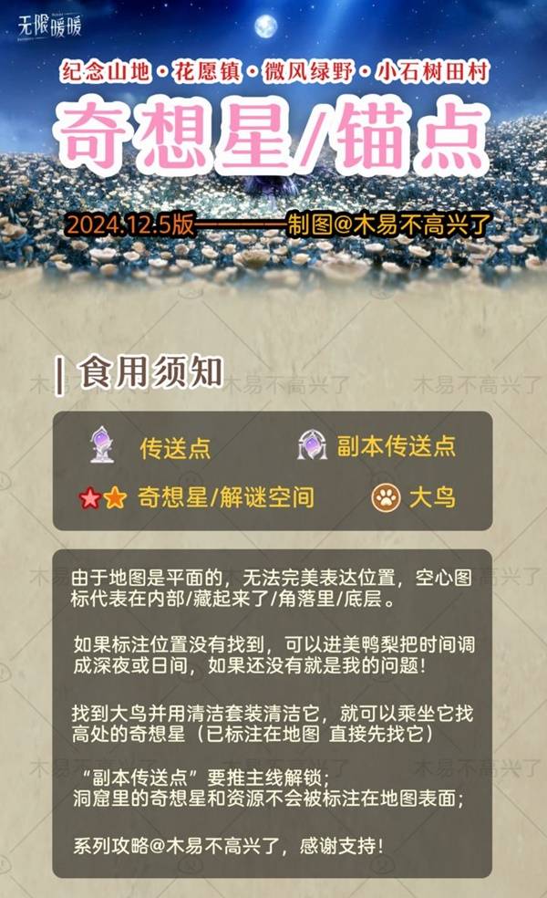 时间:2024-12-05 |《无限暖暖》中的奇想星是一种重要收集品,并且数量较多,收集起来比较麻烦。下面为大家带来由“木易不高兴了”分享的《无限暖暖》奇想星与传送点位置标注,希望对大家有用。