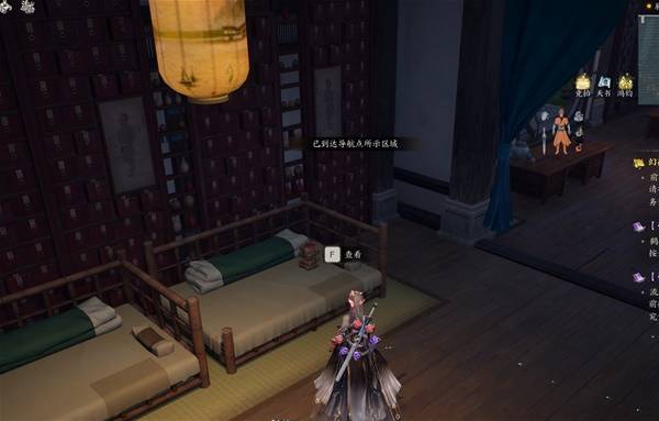 第二个大背包获取,我们来到主城的辞镜药馆,找到一个药宝,位置如图所示 (药包所在位置就是我们做“往事如烟支线,男主躺的那个床上”)