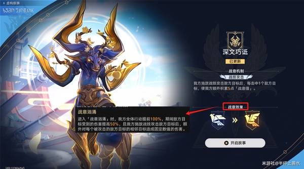 进入「战意汹涌」时,我方全体行动提前100%,期间敌方目标受到的伤害提高50%,且我方施放战技攻击敌方目标后,额外对每个被攻击的敌方目标的相邻目标造成固定数值的伤害。