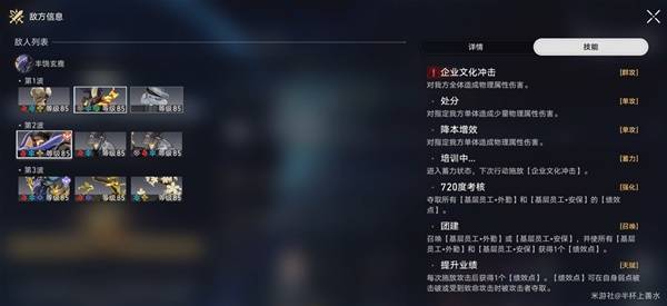 快速击杀或者击破【基层员工】弱点掠夺其绩效点,一方面增加自己的攻击,一方面避免BOSS释放【720°考核】掠夺3层【绩效点】对我方造成大量伤害;