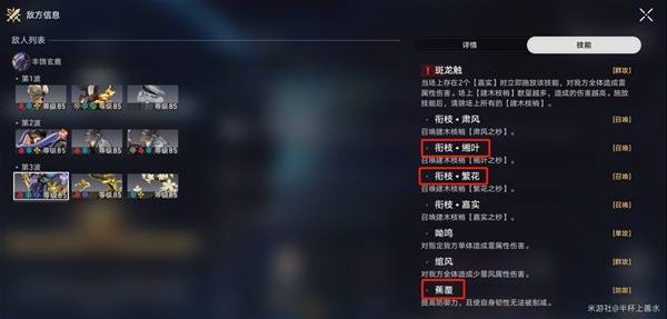 由于场地BUFF存在,实际上场地上会不断刷新【缃叶之杪】和【繁花之杪】大招【斑龙触】没有释放条件,实际上就是血量比较高的一个精英怪;