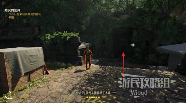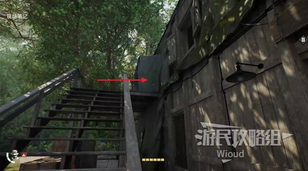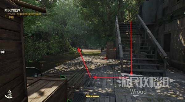 沿着楼梯回到建筑一层,往楼梯的斜后方箭头所示方向移动。