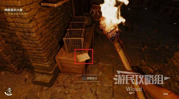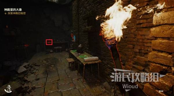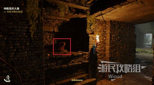 进入神庙内部,使用打火机点燃挡住洞口的木板,里面有一个雕像,先拿出来。