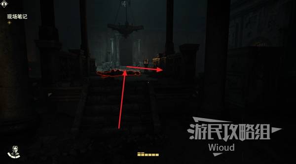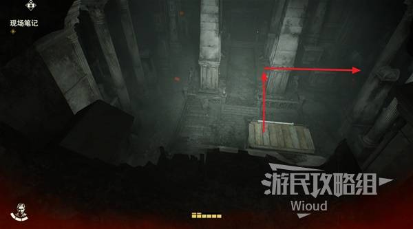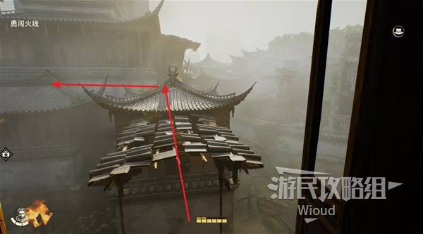 来到外面后跳过这个房檐,走到对面建筑然后右拐。