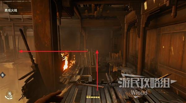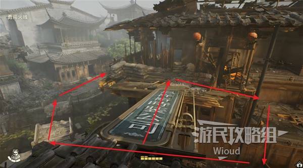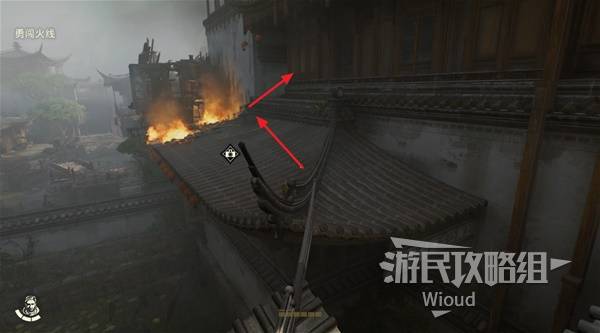 传送到上海,先往回走到着火的房子处,从右侧被炸开一个大洞的位置跳过去,这块有点难跳,需要一点点蹭过去。