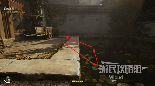 经过前方的广告牌后沿着下图路线,走到下方的路线走到左边池塘处。