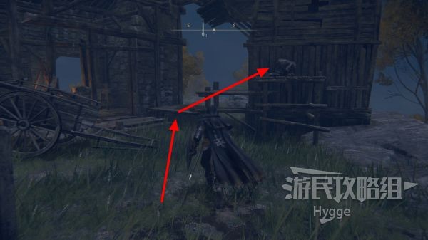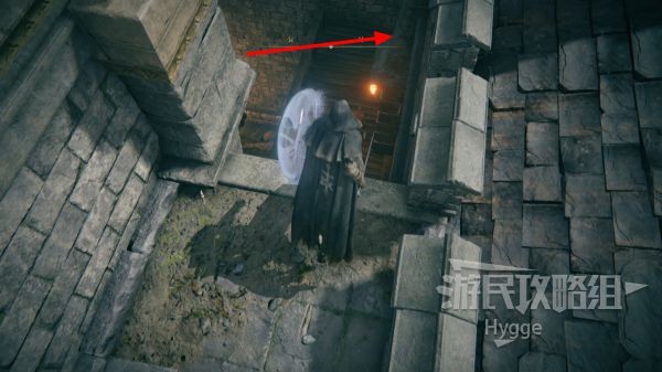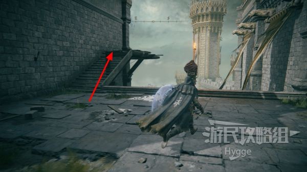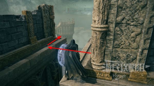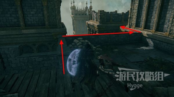 通过楼梯来到城堡顶部后,通过木台跳到城堡女儿墙上,沿着下图所示线路前进。