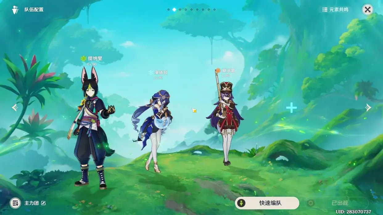 第五队:提纳里、莱依拉、夏沃蕾+希格雯,这个配队里面,提纳里就是纯粹负责主要输出的,莱依拉负责护盾和挂冰,而夏沃蕾负责开枪,至于希格雯,人家主要还是负责挂水和奶妈的,这个配队思路,我个人是倾向于让希格雯和莱依拉打个永冻或者和夏沃蕾打个烈绽放,因为提纳里可以挂草嘛,这样做就可以打出烈绽放的效果,但最终还是要提纳里负责输出的。