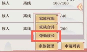 之后,点击下方的【家族管理】,会弹出三个功能,选择其中的【弹劾族长】即可。