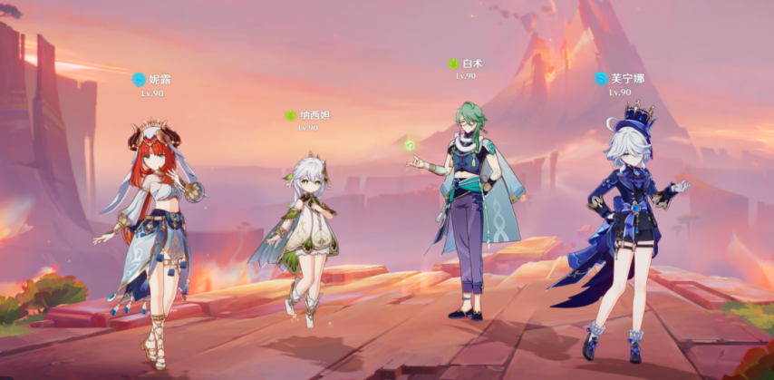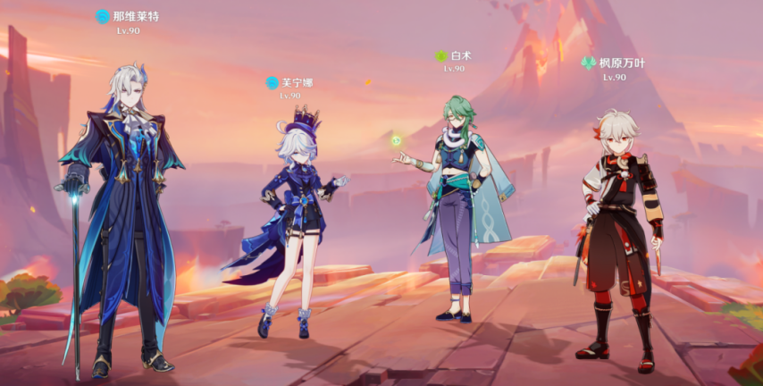 枫丹版本最强战队,那维莱特和芙宁娜组成机制匹配的前后台双C组合,再让白术战技启动群体治疗提升芙宁娜增伤效率,万叶增伤减抗再聚怪补强对群效果,当然现在白术换成希诺宁会更好。