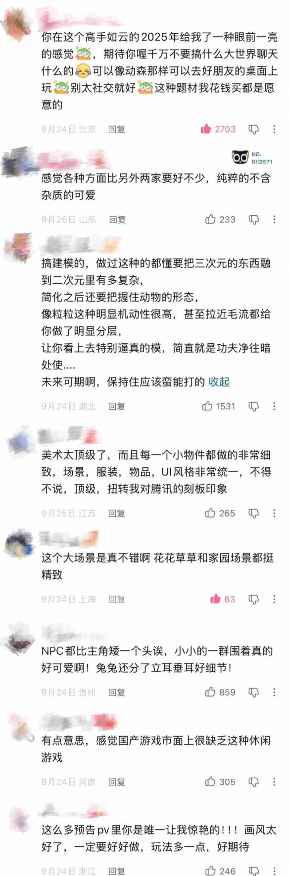 许多玩家更是直接表示“美术太顶级了”,“这么多预告pv里你是唯一让我惊艳的”,“搞建模的,做过这种的都懂要把三次元的东西融到二次元里有多复杂”。《粒粒的小人国》给游戏玩家带来一场“小而美”的震撼,用实力证明腾讯游戏仍然固守本心,用“匠人精神”给玩家带来一款真正好玩的、纯粹的新游戏。不少网友更是直接化身“赛博监工”催游戏快快上线。这波高调首曝和惊喜出圈,证明腾讯对生活模拟游戏前景的看好和重视,突破了玩家的刻板印象,实现市场口碑的成功逆转。