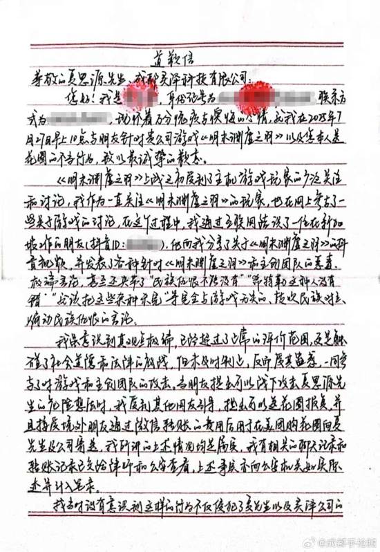 网名为“成都手枪腿”的微博网友发布了一条道歉声明:“本人郑重向夏思源先生、成都灵泽科技有限公司道歉。 ”配图是手写的道歉信,其中提到了送花圈、发表恶意诋毁游戏的极端言论等行为。 newhanawa.createAdBanner("pczwdadad1s");