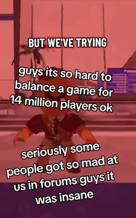 在视频中还出现了一串字幕,开发商抱怨称:“伙计们,要平衡一款有1400万玩家的游戏真的太难了。说真的,有些人在论坛上对我们非常生气,简直太疯狂了。”