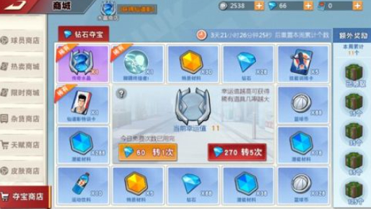 以现在的这一期为例,玩家可以选择60钻转1次,亦可选择270钻的折扣价转5次,奖池当中则包括篮球币、运动饮料、特质材料等等,也还有可能会转出钻石,当然最值得玩家期待的是标有稀有的仙道彰特训卡、脚踝终结者、以及最终的大奖传奇水晶。
