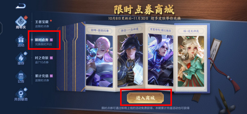 3、玩家可以在限时点券商城选择购买【英雄】【皮肤】【道具】。