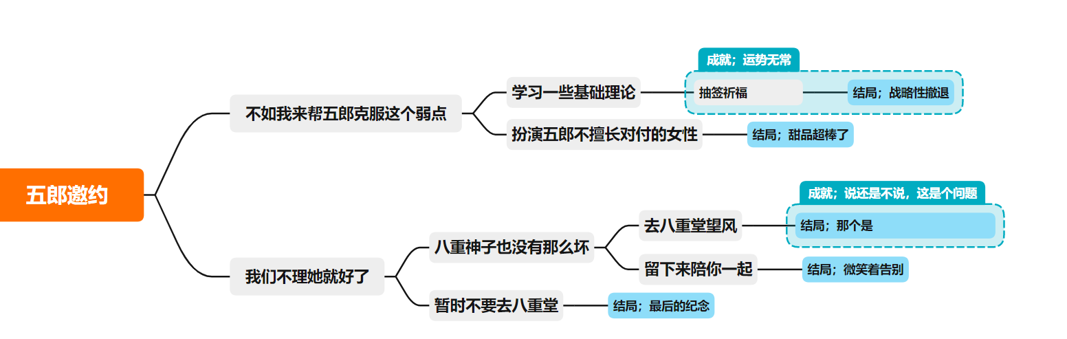 1、分支一四处询问选择一不如让我们来帮五郎克服这个弱点。选择二我们可以先学习一些理论基础……最后开启支线四处询问。结局战略性撤退。